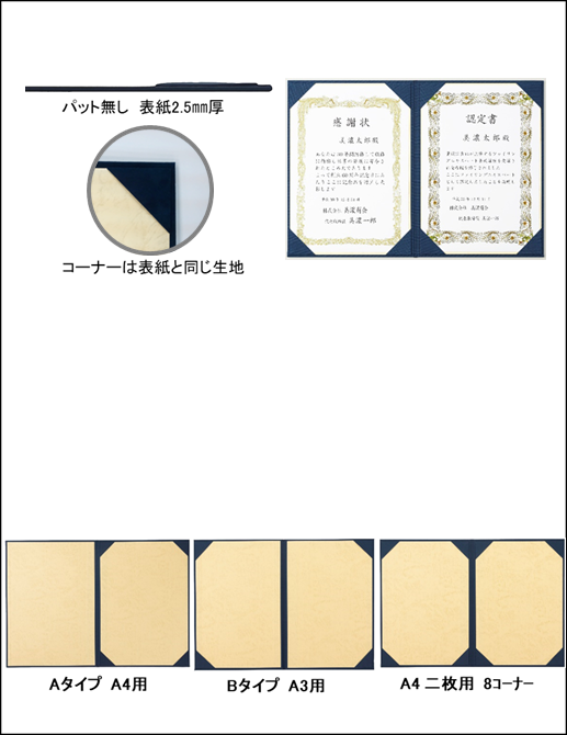 見開き8コーナー仕様 A4サイズの証書が2枚入ります。 |
