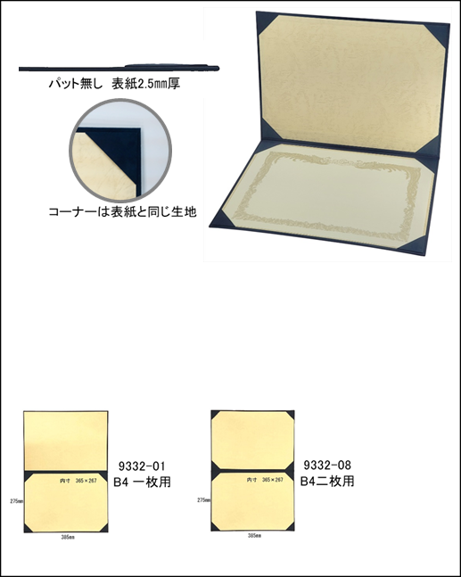 片面4コーナー仕様 B4サイズの証書が一枚入ります。 |